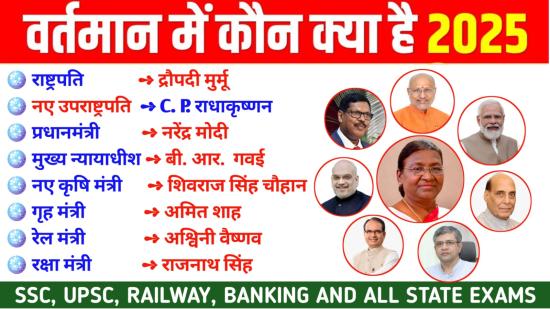 जानिए “वर्तमान में कौन क्या है 2025” की पूरी अपडेटेड सूची — भारत के राष्ट्रपति, प्रधानमंत्री, मुख्यमंत्री, राज्यपाल, सुप्रीम कोर्ट के मुख्य न्यायाधीश, प्रमुख आयोगों व संस्थानों के प्रमुख एक ही जगह पर। प्रतियोगी परीक्षाओं के लिए महत्वपूर्ण।